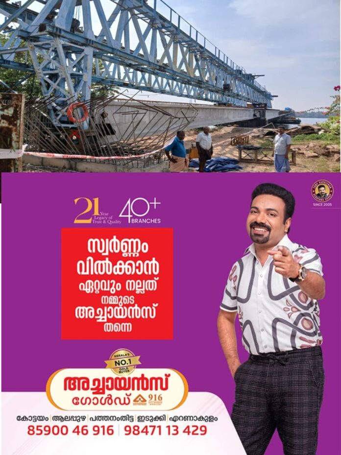 വൈക്കം: വൈക്കത്തുകാർക്ക് വേഗം കൊച്ചിയിലെത്താൻ വഴിയായി. കോട്ടയം – ആലപ്പുഴ, എറണാകുളം ജില്ലകളെ ബന്ധിപ്പിച്ചു വേമ്പനാട്ടുകായലിലെ നേരേകടവ് – മാക്കേകടവ് ഫെറിയിൽ നിർമ്മിക്കുന്ന കായൽ പാലം നേരേകടവ് കരതൊട്ടു. കായലും കരയും ചേരുന്ന ഭാഗത്തെ സ്പാനിനൊപ്പം കരയിലെ ലാൻഡ് സ്പാനിൻ്റെ നിർമാണത്തിനായി ഗർഡർ സ്ഥാപിച്ചതോടെയാണ് പാലം കരതൊട്ടത്. അടുത്ത ദിവസങ്ങളിൽ ശേഷിക്കുന്ന ഗർഡറുകൾകൂടി സ്ഥാപിച്ച് കമ്പികെട്ടി ഈ മാസമൊടുവിൽ ലാൻ്റിംഗ് സ്പാനിൻ്റെ വാർക്കൽ നടത്താനാകുമെന്നാണ് കരുതുന്നത്.