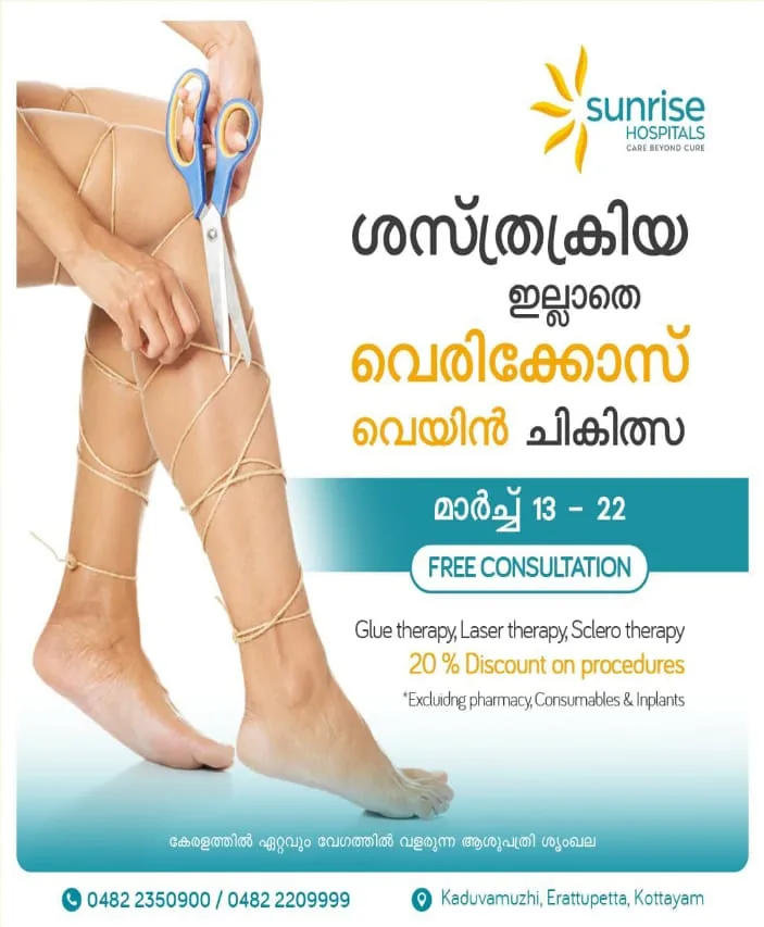 കോട്ടയം: ഈരാറ്റുപേട്ട സൺറൈസ് ഹോസ്പിറ്റലിൽ വേദനയും ബുദ്ധിമുട്ടുകളും ഇല്ലാതെ വേരിക്കോസ് വെയിൻ ചികിത്സക്കായി പ്രത്യേക ക്യാമ്പ് ഒരുക്കുന്നു.