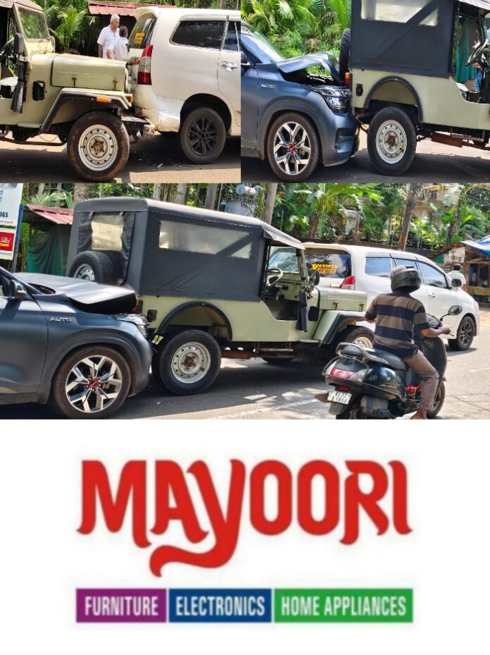 മുന്നിൽ വന്ന കാർ ബ്രേക്കിട്ടതിനേ തുടർന്ന് പിന്നാലെ വന്ന ഇന്നോവ പെട്ടെന്ന് നിർത്തുകയും തൊട്ടുപിന്നാലെ വന്ന ജീപ്പ് ഇന്നോവയിൽ ഇടിക്കുകയും ചെയ്തു. ഇതിനുപിന്നാലെ വന്ന കിയ സെൽറ്റോസ് ജീപ്പിൽ ഇടിച്ച് കയറി. മൂന്ന് വാഹനങ്ങളും ഭാഗികമായി തകർന്നു. ആർക്കും പരിക്ക് ഇല്ല.