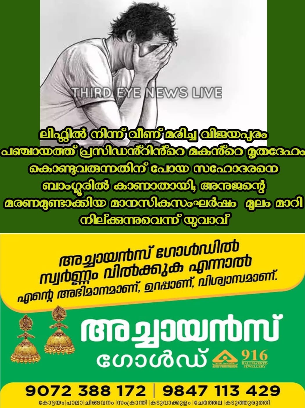 കോട്ടയം: ബംഗളൂരുവിൽ ലിഫ്റ്റിൽ നിന്ന് വീണ് മരിച്ച വിജയപുരം പഞ്ചായത്ത് പ്രസിഡന്റ് വി.ടി സോമൻ കുട്ടിയുടെ മകൻ ശരൺ വി.മോഹന്റെ സഹോദരൻ ശരത്തിനെ കാണാതായതായി വിവരം. അനുജന്റെ മൃതദേഹം കൊണ്ടുവരുവാനായി ബന്ധുക്കൾക്കൊപ്പം ബാംഗ്ലൂർക്ക് പോയതാണ് ശരത്ത്. ബോഡി അവിടെ നിന്നും നാട്ടിലേക്ക് അയച്ച ശേഷമാണ് ശരത്തിനെ കാണാതാകുന്നത്.