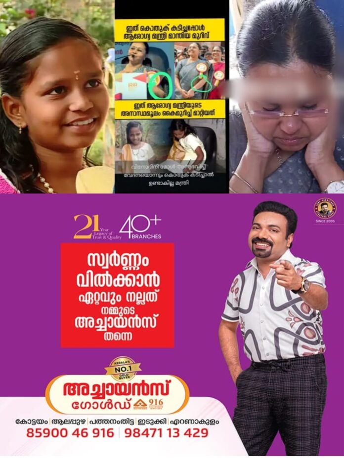 വിനോദിനിയുടെ അമ്മ പ്രസീത വാട്സ്അപ്പ് സ്റ്റാറ്റസിലൂടെയാണ് ആരോഗ്യമന്ത്രിയെ വിമർശിച്ചിരിക്കുന്നത്. മന്ത്രിയുടെ കൈയിലെ മുറിവിൻ്റെ ഫോട്ടോയും മന്ത്രിയുടെ അനാസ്ഥമൂലം കൈമുറിച്ചു മാറ്റിയ വിനോദിനിയുടെ ഫോട്ടോയും പോസ്റ്റിലുണ്ട്.