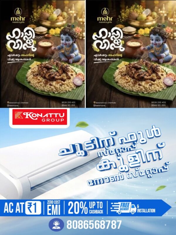 വിളമ്പി വെച്ച കുഴി മന്തിക്കും ചിക്കനും മുന്നില് അതിലേക്ക് കൊതിയോടെ നോക്കി ഇരിക്കുന്ന കൃഷ്ണന്റെ ചിത്രം വെച്ചായിരുന്നു പരസ്യം. ചേർത്തല വടക്കേ അങ്ങാടിക്കവല സെൻട്രല് ജുമമസ്ജിദിന് സമീപം പ്രവർത്തിക്കുന്ന മെഹ്ർ എന്ന സ്ഥാപനമാണ് വർഗീയ വിദ്വേഷം ജനിപ്പിക്കുന്ന പരസ്യവുമായി രംഗത്തെത്തിയത്.