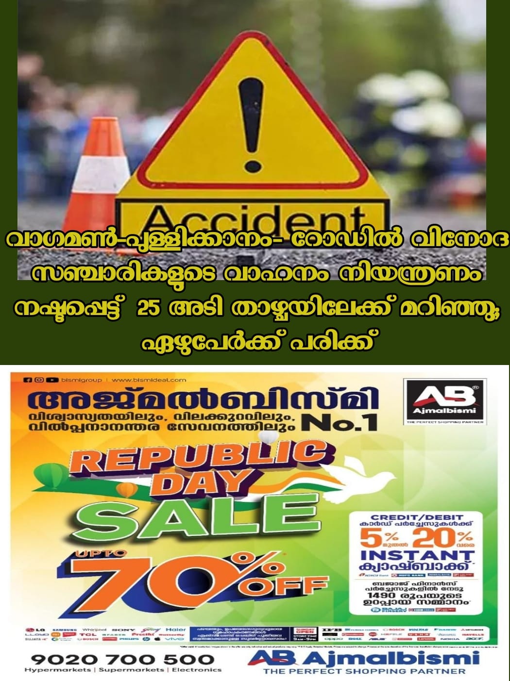തൊടുപുഴ : വാഗമണ്-പുള്ളിക്കാനം- കാഞ്ഞാര് റോഡില് വീണ്ടും വിനോദ സഞ്ചാരികളുടെ വാഹനം അപകടത്തില്പ്പെട്ടു. യാത്രികരായ ഏഴുപേര്ക്ക് പരിക്കേറ്റു. വാഗമണ്ണില്നിന്നും മടങ്ങവെ കൂവപ്പള്ളിക്ക് സമീപം നിയന്ത്രണം നഷ്ടമായ കാര് 25 അടി താഴ്ചയിലേക്ക് മറിയുകയായിരുന്നു.