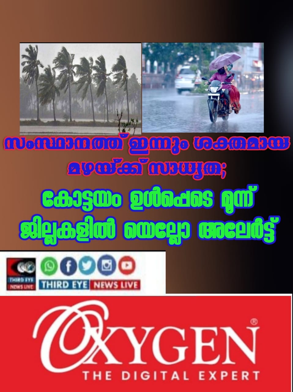 തിരുവനന്തപുരം: സംസ്ഥാനത്ത് ഇന്നും ശക്തമായ മഴക്ക് സാധ്യതയെന്ന് കാലാവസ്ഥ നിരീക്ഷണ കേന്ദ്രത്തിന്റെ മുന്നറിയിപ്പ്. കോട്ടയം ഉൾപ്പെടെ മൂന്ന് ജില്ലകളിൽ യെല്ലോ അലേർട്ട് പ്രഖ്യാപിച്ചു.