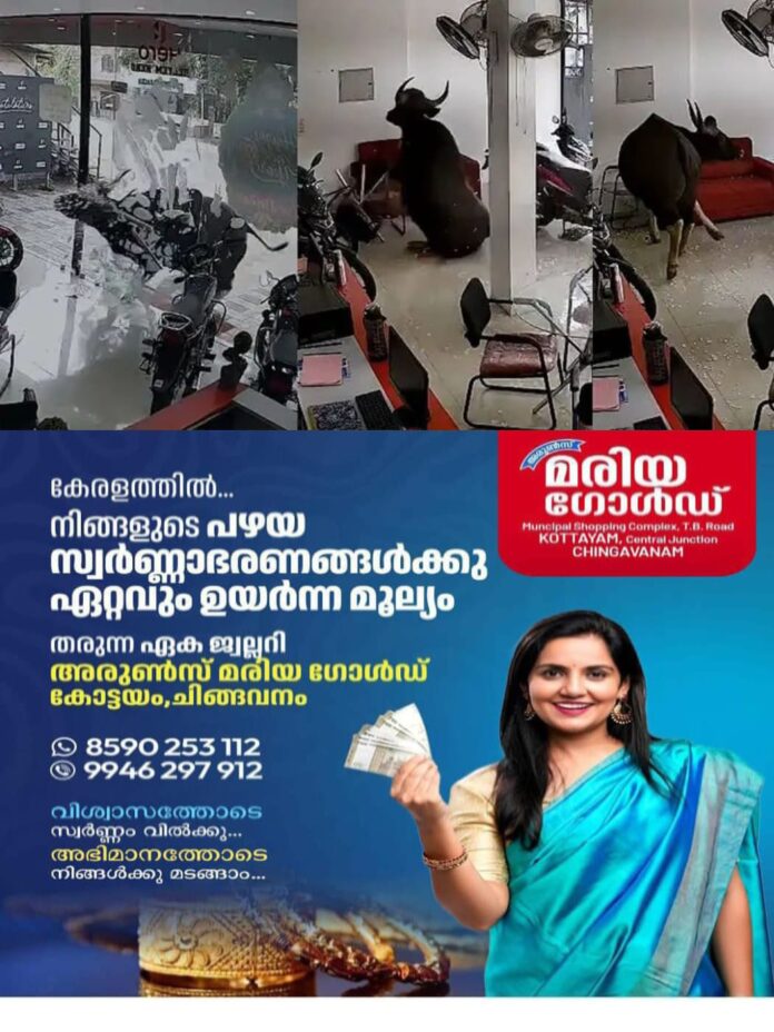 കണ്ണൂർ: കൂത്തുപറമ്പ് പുറക്കളത്ത് പൂട്ടിയിട്ടിരുന്ന ബൈക്ക് ഷോറൂമിലേക്ക് പാഞ്ഞുകയറി വിരണ്ടോടിയ കാട്ടുപോത്ത്.