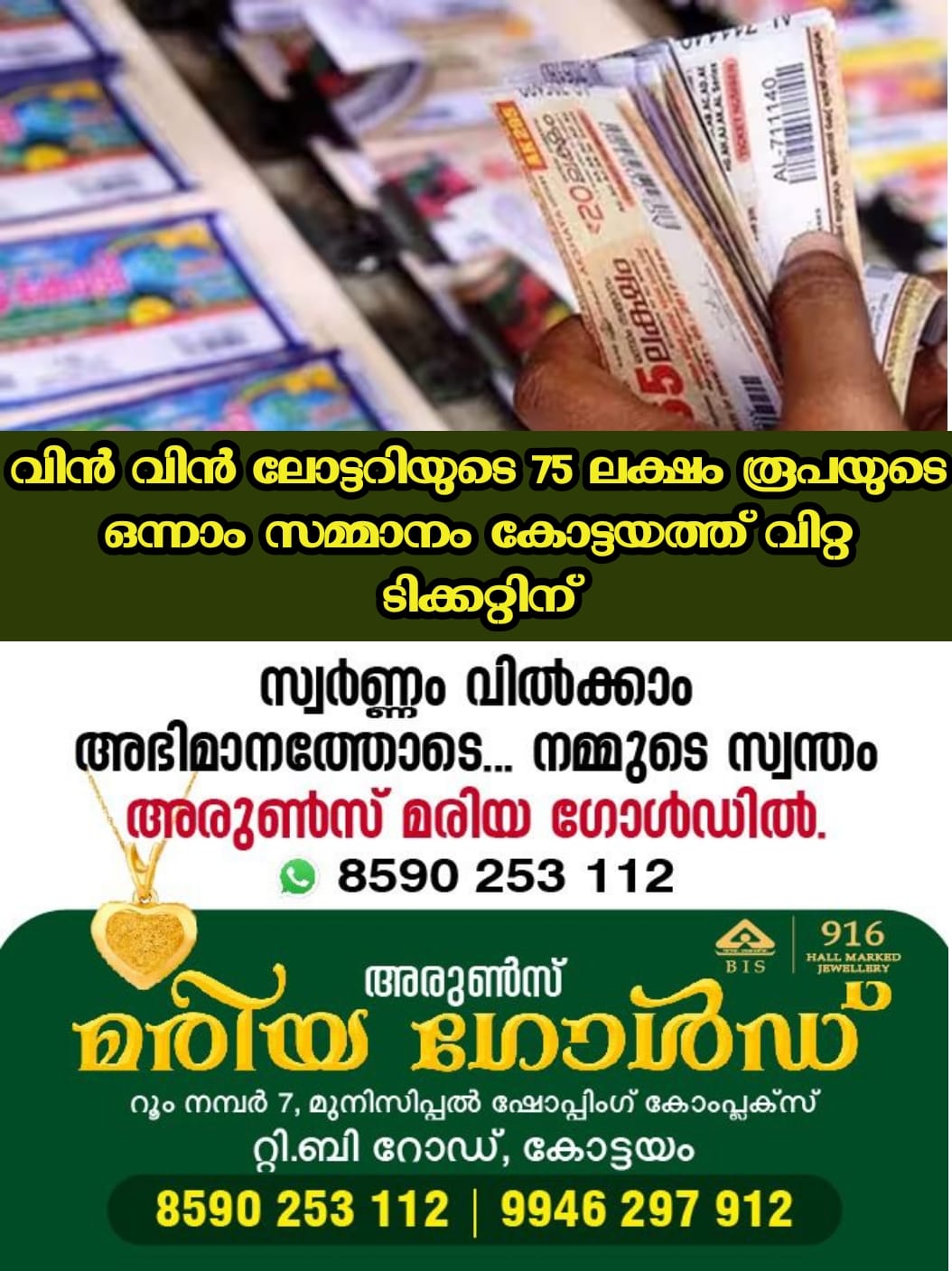 വിൻ വിൻ ലോട്ടറിയുടെ 75 ലക്ഷം രൂപയുടെ ഒന്നാം സമ്മാനം കോട്ടയത്ത് വിറ്റ ടിക്കറ്റിന്; ഭാ​ഗ്യശാലിയ്ക്കായി അന്വേഷണം തുടങ്ങി