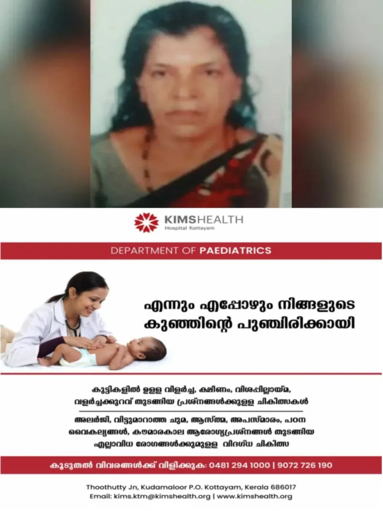 വ്യാഴാഴ്ച പേവിഷബാധയുടെ രോഗലക്ഷണങ്ങള്‍ കാട്ടിയതോടെ തുറവൂര്‍ താലൂക്ക് ആശുപത്രിയിലും തുടര്‍ന്ന് ആലപ്പുഴ മെഡിക്കല്‍ കോളേജിലും ചികിത്സ തേടിയെങ്കിലും വെളളിയാഴ്ചയോടെ മരണം സംഭവിച്ചു. ഭര്‍ത്താവ്: പൊന്നന്‍. മക്കള്‍:സജിത്ത്, പ്രതീഷ്ബാബു.
