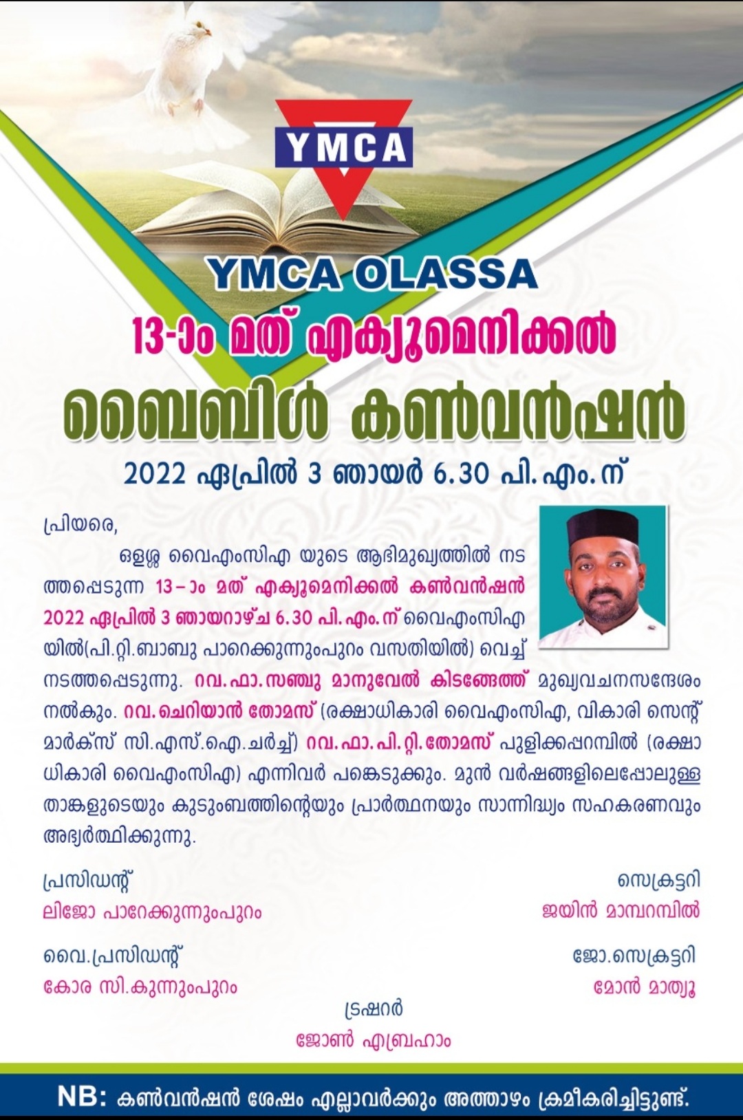 ഒളശ: വൈഎംസിഎയുടെ 13-ാം മത് എക്യൂമെനിക്കൽ ബൈബിൾ കൺവൻഷൻ 2022 ഏപ്രിൽ 3 ന് ഞായർ 6.30 pm ന് വൈഎംസിഎയ്ക്ക് സമീപം പി.റ്റി. ബാബു പാറെക്കുന്നുംപുറത്തിൻ്റെ വസതിയിൽ വച്ച് നടക്കും.