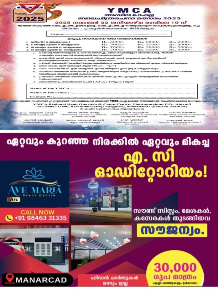 5 വയസ്സിൽ താഴെയുള്ള നഴ്സറി വിഭാഗം കുട്ടികൾക്ക് കളറിംഗ് മൽസരമാണ് നടത്തുന്നത്. വരയ്ക്കുന്നതിനാവശ്യമായ പേപ്പർ വൈ.എം.സി.ഏ.യിൽ നിന്നും നൽകും. പങ്കെടുക്കാൻ താൽപര്യമുള്ളവർ വ്യാഴാഴ്ചയ്ക്കു മുൻപ് പേരുകൾ റജിസ്റ്റർ ചെയ്യണം. ഫോൺ 94474 15184.