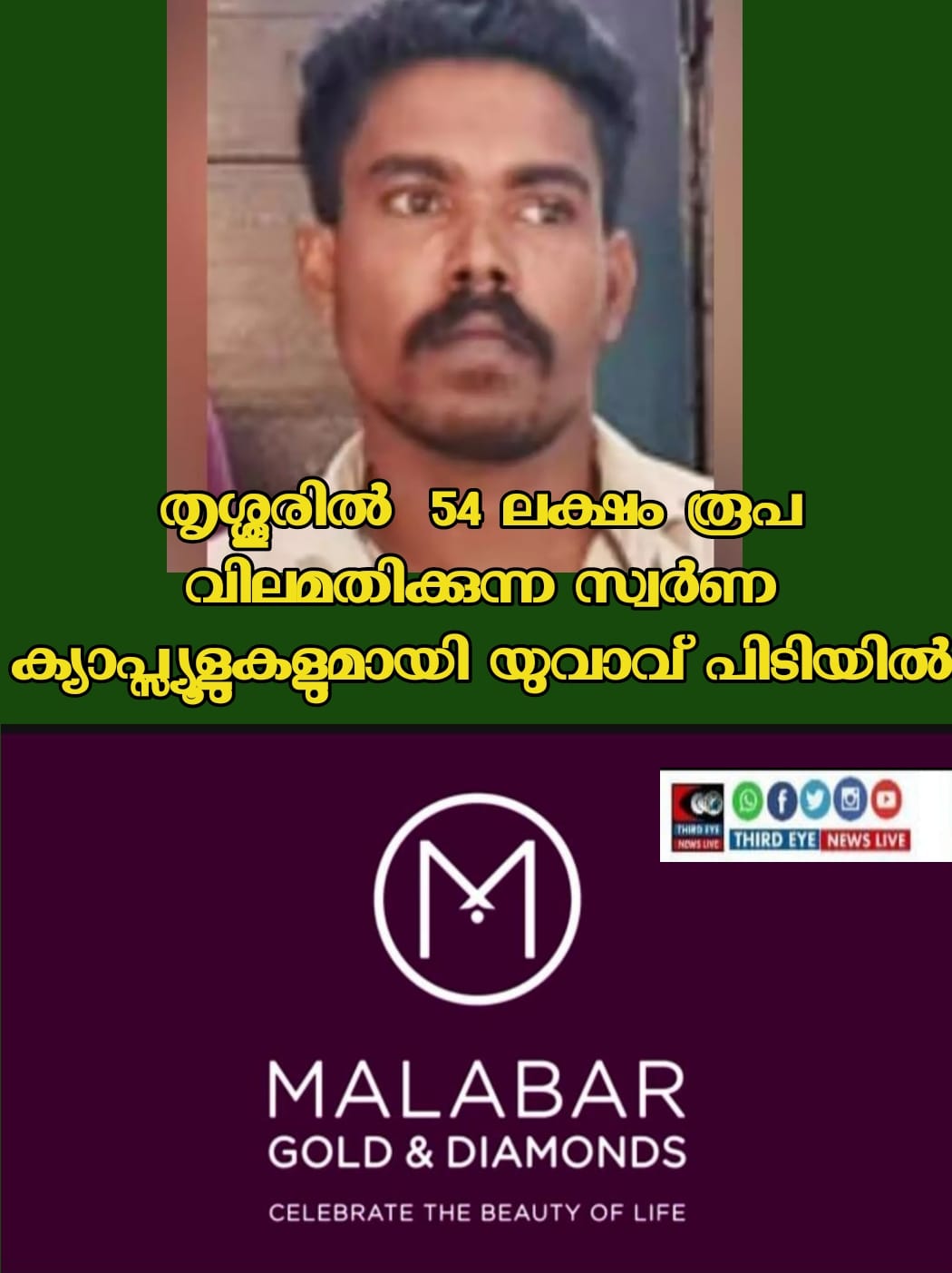 തൃശ്ശൂര് റെയില്വെ സംരക്ഷണ സേനയിലെ സബ് ഇന്സ്പെക്ടര് അജയ്കുമാര്, എഎസ്ഐ സിജോ സേവിയര്, ഹെഡ് കോണ്സ്റ്റബിള് എം ബി ബിനു, കോണ്സ്റ്റബിള്മാരായ ജി വിപിന്, എസ് വി ജോസ് എന്നിവര് ചേര്ന്നാണ് ഇയാളെ പിടികൂടിയത്. തുടര്ന്ന് സേന കസ്റ്റംസിനെ വിവരം അറിയിക്കുകയും കസ്റ്റംസ് ഇയാള കസ്റ്റഡിയില് എടുക്കുകയുമായിരുന്നു.