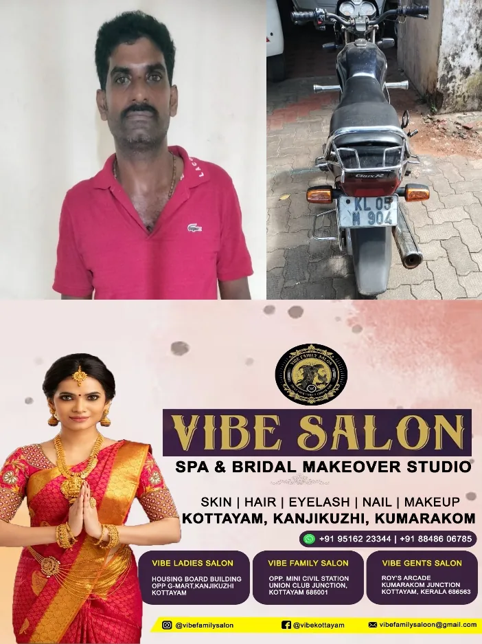 ഇയാൾ സഞ്ചരിച്ച യമഹ ക്രക്സർ ബൈക്കും ഏഴ് ലിറ്റർ മദ്യവും എക്സൈസ് കസ്റ്റഡിയിലെടുത്തു.